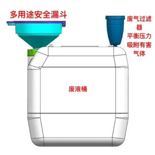 鑒于有部分溶劑應存儲在玻璃瓶中,漏斗針對實驗室常用4L小口棕色試劑瓶做了適配,易于安裝在玻璃瓶上。參考下圖。