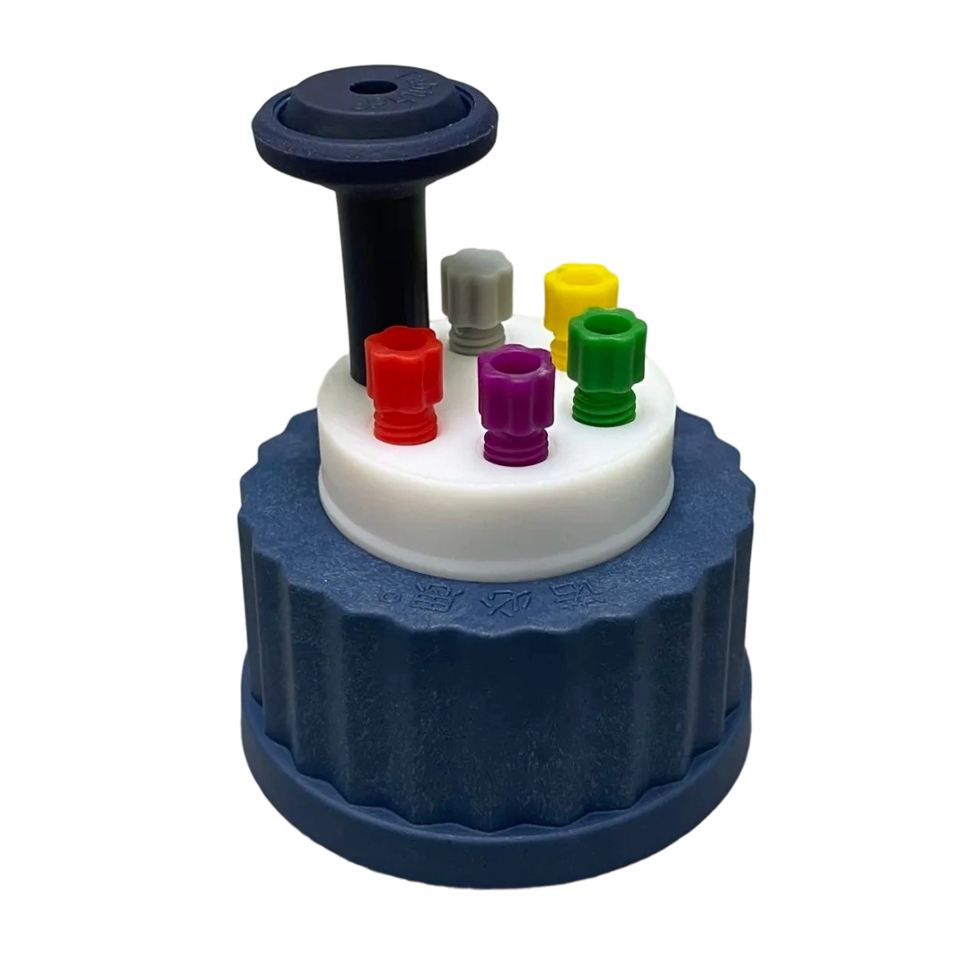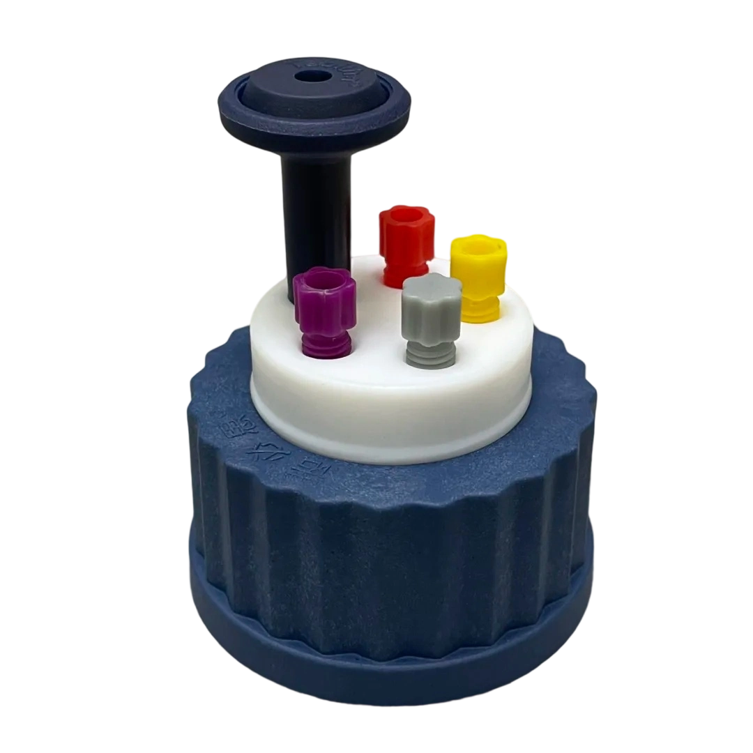 ,四孔溶劑蓋 GL45,可接最多 4 根溶劑管,含:單向進氣閥 A 款*1,紅色3.2mm ?管路接頭*4, 灰色堵頭*3,如下圖: